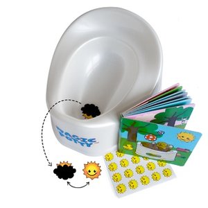 De training bestaat uit 2 'magic' Plasstickers™ voor in een potje, een kinderboekje, stappenplan en 75 zonnetje beloningsstickers.