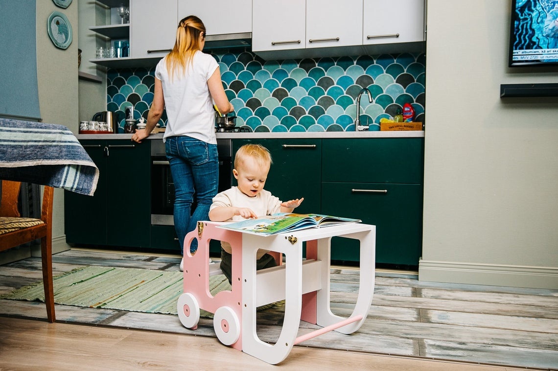 Transformeer de step stool in tafel- en stoelvorm en ga naast of voor je kind zitten en lees, schilder of lijm aan elkaar.