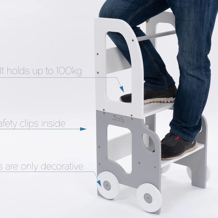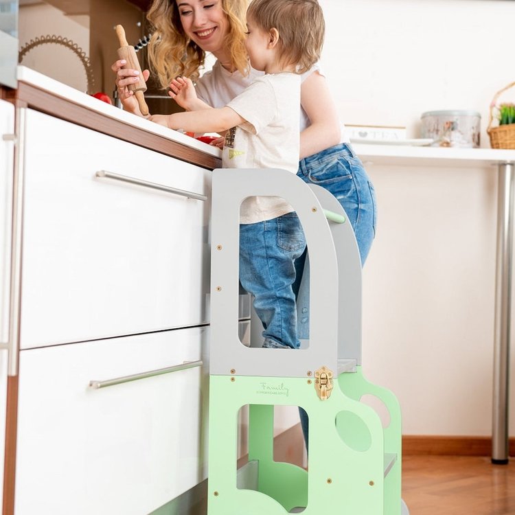 Hij is ontworpen en gemaakt om te leren koken (mama / papa helpen), klimmen, zitten bij het gezin aan tafel en eten of gewoon spelen.