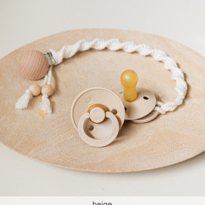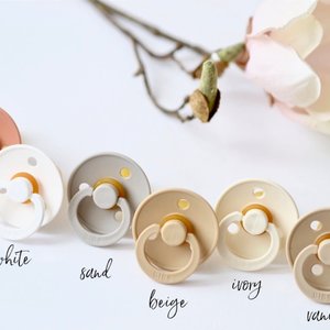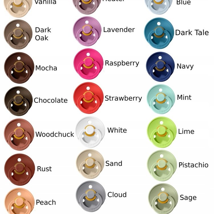 The pacifier is available in a beautiful color palette with more than 30 different colors. Everything from retro colors such as chocolate, apricot and rust to neutral colors like cloud, ivory and iron. They also come in classic colors such as blush and baby blue.